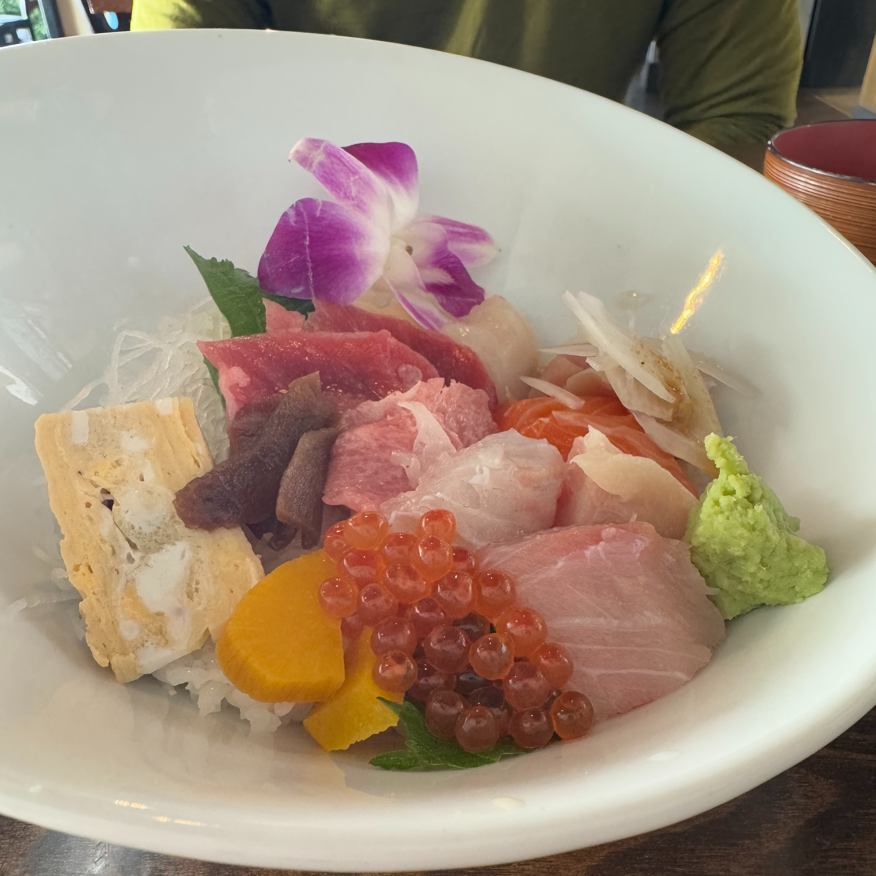 The day we went in, there were two lunch specials available: the Omakase lunch special for $64 and the Makunouchi lunch special for $26. I went for the Makunouchi which had tempura, chawanmushi, nigiri, and kaarage. You also get side dishes of squid, tamago, and scallops with crab. The meal also comes with miso soup and a green salad. Hubs ordered the Special Chirashi bowl (which was not on the special menu for lunch).